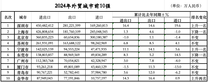第一财经梳理海关总署的数据,2024年全国外贸前10强城市别离为:深圳、上海、姑苏、宁波、东莞、金华、广州、杭州和青岛。